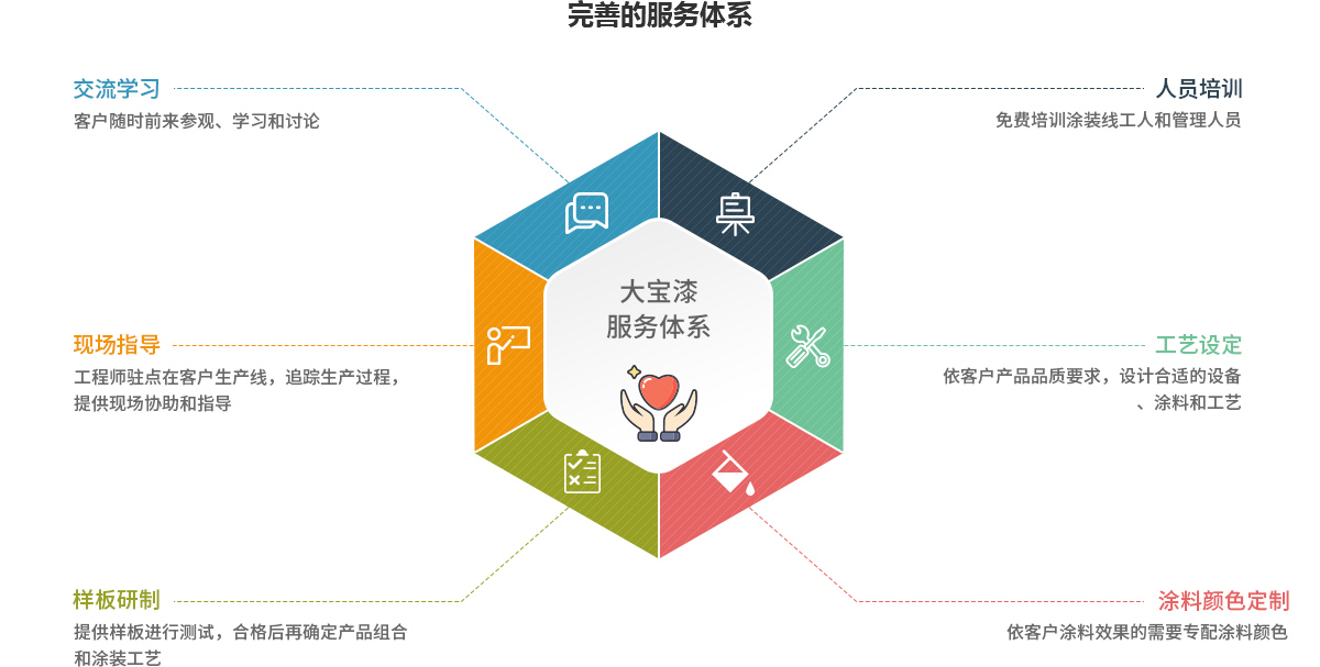 同時,大(da)寶漆還專(zhuan)們(men)指派熟悉産(chan)品(pin)施工(gong)及(ji)産(chan)品(pin)應用(yong)的(de)工(gong)程(cheng)服務(wu)人(ren)員(yuan),長(zhang)期進(jin)駐服務(wu)網點,爲(wei)客戶(hu)提供點對點式(shi)專(zhuan)業服務(wu),包括調色打闆、樣品(pin)製(zhi)作(zuò)、駐廠(chǎng)指導(dao)、問題解決、人(ren)員(yuan)培訓、售後(hou)服務(wu)等(deng),并可(kě)在(zai)24小(xiǎo)時內(nei)趕赴現(xian)場(chang)給予客戶(hu)專(zhuan)業的(de)技(ji)術(shù)指導(dao)服務(wu)。