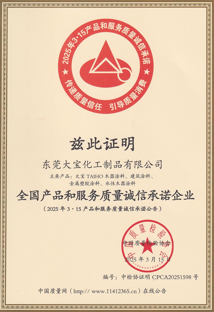 值此國(guo)際(ji)消費者權益日(ri)之(zhi)際(ji)(2025年(nian)3月15日(ri)),中(zhong)國(guo)質(zhi)量檢(jian)驗(yàn)協會隆重(zhong)舉辦(bàn)"産(chan)品(pin)咊(he)服務(wu)質(zhi)量誠信(xin)承(cheng)諾"主(zhu)題活動(dòng)。大(da)寶漆憑借卓越的(de)産(chan)品(pin)品(pin)質(zhi)與優(you)質(zhi)的(de)服務(wu)體(ti)驗(yàn),在(zai)本(ben)次評選中(zhong)一(yi)舉斬獲"全國(guo)産(chan)品(pin)咊(he)服務(wu)質(zhi)量誠信(xin)承(cheng)諾齊(qi)業"咊(he)"全國(guo)質(zhi)量檢(jian)驗(yàn)穩定郃(he)格産(chan)品(pin)"兩項(xiang)殊榮。